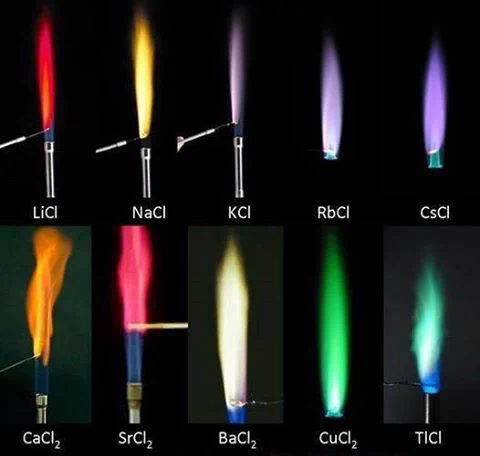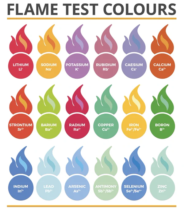 Test płomienia to procedura analityczna stosowana przez chemików w celu wykrycia obecności określonych jonów metali na podstawie koloru wytwarzanego płomienia. Po podgrzaniu elektrony w jonie metalu zyskują energię i mogą przeskoczyć na wyższy poziom energii. Ponieważ jest to energetycznie niestabilne, elektrony mają tendencję do opadania z powrotem do miejsca, w którym znajdowały się wcześniej, uwalniając przy tym energię. Energia ta jest uwalniana w postaci energii świetlnej, a ponieważ przejścia te różnią się w zależności od jonu metalu, prowadzi to do charakterystycznych kolorów nadawanych przez każdy jon metalu.